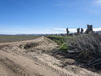 A rugged road winds through the sandy desert of California, USA on a clear day, showcasing the natural beauty of the region with its rocky formations, woody plants, and vegetation.