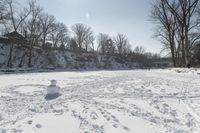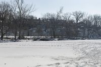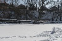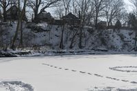 A beautiful view of a frozen lake surrounded by snow-covered trees in Canada during autumn.