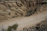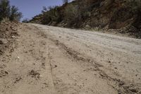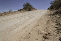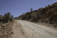 dirt road through the desert with brush and trees in background along side of hill with dirt, vegetation and sky
