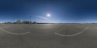 A beautiful scenic landscape with a city skyline in the distance, showcasing lush vegetation, a tree-lined road, and street lights illuminating the path. The clear sky and open space create a serene and inviting atmosphere.