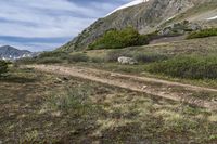 A stunning view of the rugged mountain terrain in Colorado, USA. The highland grass and vegetation cover the slopes, while a snow-capped mountain range stretches into the distance. Loveland Pass, elevated and surrounded by natural beauty, offers a straight road leading to Pass Lake, a tranquil water bank. The clouds dot the sky, creating a picturesque scene in this alpine biome.