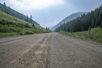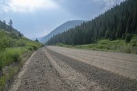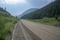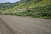A picturesque view of Kebler Pass in Colorado, USA. The road winds through mountains and highlands, surrounded by lush grass, alpine vegetation, and evergreen trees. The gravel and asphalt road surface adds contrast to the natural environment.