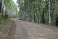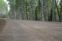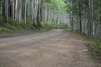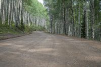 A beautiful view of Kebler Pass in Colorado, USA, showcasing a picturesque landscape with mountains, forests, and open spaces. The road surface is a mix of sand, dirt, and asphalt, leading straight down the road. The surrounding vegetation includes trees such as aspen, larch, and evergreen, along with grass and shrubs. A fence and gravel lot can be seen on one side, while palm trees and a distant alpine backdrop add to the beauty of the scene. An automobile with its tire tracks on the road and a shadow cast by the trees give a sense of movement and tranquility to the image.