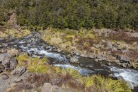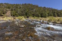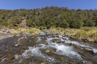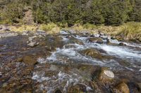 A breathtaking view of a mountain river flowing through a lush forest with abundant vegetation and towering trees in a serene natural setting.