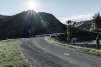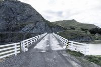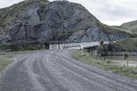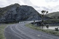 A stunning view of a mountain landscape with a river bridge crossing over the clear blue water under a sunny sky.