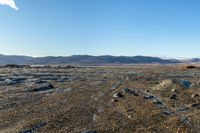 view of rocky area in open area with sunny sky and mountains behind it and clear blue sky