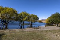 A captivating view of the natural environment in New Zealand, showcasing the lush green grass, towering trees, and serene water resources along the shore of a beautiful lake on the South Island.