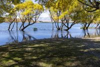 A picturesque view of the South Island in New Zealand, showcasing its low grassy banks, crystal clear water, and captivating reflections. The serene natural environment offers a perfect destination for recreational activities.