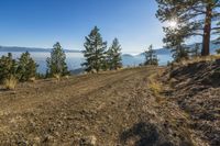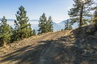 A stunning view of the coastal mountain range and lush forests in Okanagan Valley, British Columbia, Canada. The clear blue sky and sunlight illuminate the picturesque terrain, with a dirt road winding through the evergreen trees and woody plants.