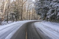 a curved road is bordered by trees on a snow covered mountain side and the road is very icy and snowy