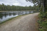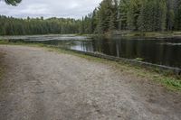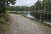 Aerial view of a gloomy day in Ontario, Canada. The landscape features lush vegetation, larch trees, and a winding road surface leading to a tranquil lake. The grey sky reflects on the calm water, creating a serene atmosphere.
