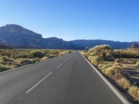 A stunning view of the Canary Islands, Tenerife, showcasing the diverse vegetation and plant community. The landscape features a road surface with asphalt stretching into the horizon, surrounded by mountain landforms. The clear sky adds to the beauty of this rural location in Europe's nature-rich national park. The grass-covered low mountains, with clouds hovering above, create a picturesque slope. The straight road, made of tar, leads through the plain, offering a mesmerizing journey through these elevated highlands.