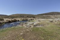A breathtaking view of a mountainous terrain with lush vegetation and a clear blue sky. A river cuts through the open space, adding to the natural beauty of the landscape.