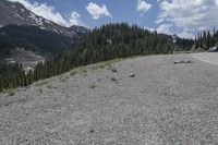a group of birds are resting on a gravel road surrounded by mountains and trees and snow