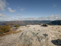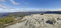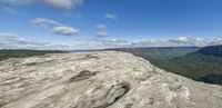 A rugged and scenic mountain landscape with a breathtaking view of a valley below. The horizon stretches far into the distance, showcasing the diverse terrain and rock formations. This stunning nature overview captures the beauty of the highland region with its open spaces, vegetation, and tree-covered slopes. The mountain range and road add depth to the picturesque scene, while the outcrops and plant communities enhance the geological phenomena. The grass surface, cumulus clouds, and sandstone formations create a captivating visual platform, reminiscent of a forest canyon or a makhtesh.