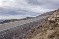 A picturesque mountain road winds through the highlands, surrounded by lush vegetation and towering trees. The asphalt road, with its curving path, offers a stunning view of the gloomy landscape under a grey sky.