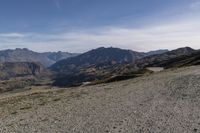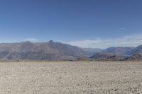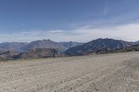 A low dirt road winds through the mountains of New Zealand on a beautiful sunny day, showcasing the stunning landscape and natural highlands. The hills and mountain landforms create a picturesque wilderness, with cliffs and clouds adding to the dramatic scenery. The gravel surface of the road leads to a mountain range, where a wadi valley can be seen in the distance. The open space and natural environment are perfect for capturing the beauty of this mountain pass and its geological features. Contrails in the sky add a touch of modernity to this otherwise untouched landscape on the South Island.