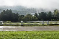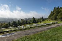 A tree-lined road curves through the highland landscape of North Carolina, offering stunning vistas of the lush green valleys and elevated mountain slopes. This recreational destination is perfect for outdoor activities and enjoying the sunny Appalachian weather.
