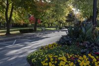 A lush suburban park in Toronto, Ontario, Canada, with beautiful green vegetation, deciduous trees, and a road surface surrounded by nature and sunlight. The park features outdoor furniture including benches for recreational purposes.