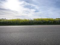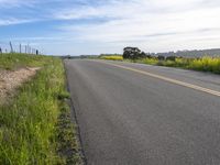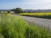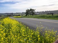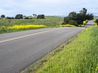 A beautiful landscape in California, USA with a road stretching across the lush green fields and yellow flowers, under a gloomy grey sky.