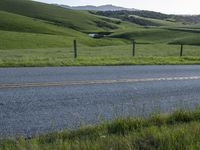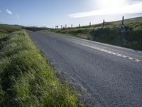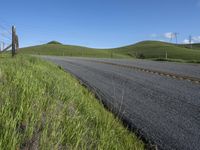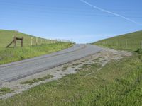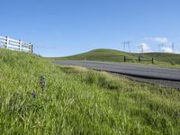 an empty country road with the side of a green grassy hill lined with fences and wires
