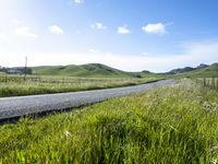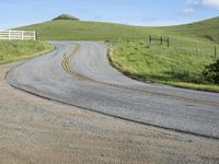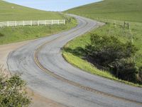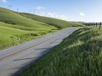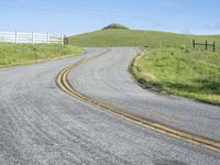 A picturesque road with asphalt surface winding through the lush green landscape of California, USA on a sunny day