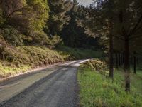 A curved road with asphalt and gravel surface winding through a rural landscape, surrounded by grass, trees, and vegetation, under the bright sunlight and clouds casting shadows. Location: Natural environment, countryside.
