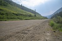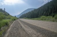 A picturesque landscape of Crested Butte, Colorado, showcasing a road surrounded by lush vegetation and towering trees, with a smooth asphalt surface leading through Kebler Pass. This rural alpine scene captures the beauty of the USA's natural environment, with rolling hills, majestic mountains, and a clear blue sky dotted with fluffy clouds. The dirt and gravel road cuts through the grassy fields and sandy plains, offering a straight and captivating view down the road.