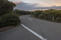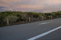 A picturesque road winds through a highland landscape with lush vegetation and rolling hills under a beautiful sunrise.