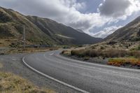 A gloomy day on a scenic road winding through the highland mountains, surrounded by lush vegetation and woody plants