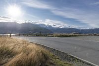 A picturesque road winds through the highlands of New Zealand, with stunning views of mountains, lakes, and lush green grass under a sunny sky.
