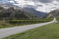 A picturesque road winds through the mountains and lush green landscape of New Zealand's South Island, surrounded by nature, trees, and grass.