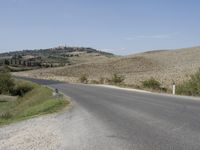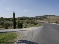 A beautiful asphalt road winds through the picturesque landscape of Tuscany, Italy, on a sunny day. Lined with trees and surrounded by hills and rural land lots, this road showcases the stunning natural beauty of the region.