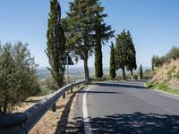 A straight road lined with cypress trees and surrounded by the picturesque landscape of Tuscany, Italy. The rugged terrain and clear blue sky make it a perfect destination for nature lovers and road trip enthusiasts. The Armco barrier along the road ensures safety while enjoying the beauty of the valley.
