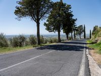 a road lined with trees and bushes is seen in the distance are trees, on either side of the road and steep hills