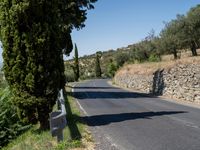 a couple of bikers are riding down the road near some trees and bushes and hills