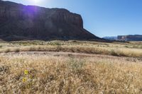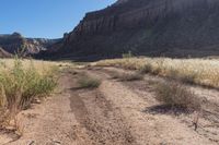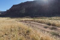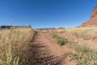 A picturesque view of a straight road surrounded by red rock cliffs and desert landscape in Canyonlands, Utah.