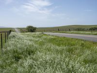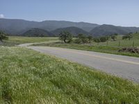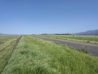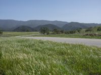 A lush green prairie field with grass on a clear sky day in California, USA. The road surface curves through the picturesque countryside with mountains in the horizon.