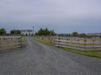 A gloomy day in the countryside with a straight road leading through fields of grass and vegetation, lined by a fence and surrounded by trees.