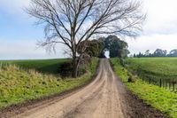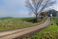 A low angle shot of a dirt road on a sunny day, winding through lush green fields in a rural area