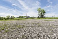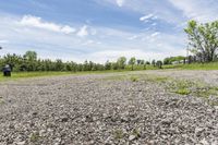 the large field is filled with stones and dirt with trees on the side and clouds in the sky