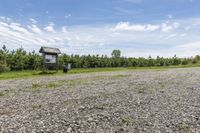 a empty lot on a sunny day with trees and some rocks around it and a green grassy area in the background