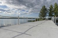 A stunning view of a peaceful lake surrounded by nature in Toronto, Canada. The calm water reflects the beautiful clouds and the straight road leading to the lake. The guard rail and handrail ensure safety for visitors to enjoy the walkway and bridge. This fixed link provides a perfect spot for recreation and relaxation, with a boardwalk, pier, and bank for outdoor activities. The concrete surface and concrete bridge blend seamlessly with the natural surroundings. Witness the serene beauty of this coastal area in Toronto with its breathtaking horizon and reflections.