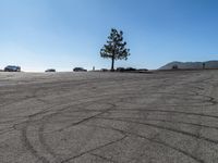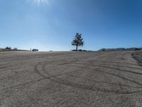 A straight road stretches far into the distance, lined with trees and bordered by majestic mountains. The clear blue sky and sunny weather create a picturesque landscape.