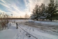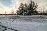 A snowy road lined with trees at dawn in a residential suburb of Toronto, Canada. The sun is visible, casting a warm glow on the snow-covered landscape.