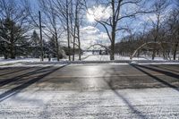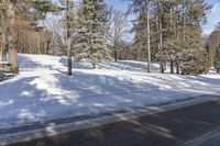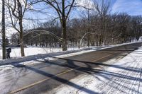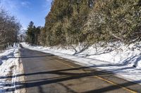 A beautiful winter landscape in Ontario, Canada with snow-covered trees and a road winding through the forest. The sunlight casts long shadows on the asphalt road surface, creating a stunning contrast against the white snow. The clear blue sky and fluffy white clouds add to the picturesque scene.