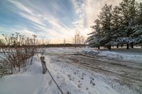 a very snowy road with some trees and bushes in the background as the sun begins to set