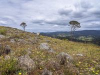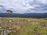 A picturesque view of the Sapphire Coast Hinterland in Bega, New South Wales, Australia. The open grass surface and lush vegetation create a stunning plant community amidst the bald hills. The grey sky adds a touch of gloom, making it a peaceful and serene scene.