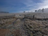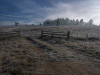 A peaceful rural landscape with lush vegetation, a tall tree, and a wooden fence under a clear blue sky.