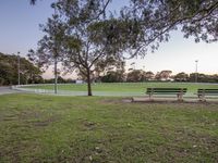 A peaceful residential area with lush green vegetation and neatly trimmed grass surfaces under a clear sky. The dawn light casts a soft shade over the suburban land lot, highlighting the concrete road surface and the beautiful tree branches. In the distance, a park with outdoor furniture and benches can be seen, providing a perfect recreational space for residents.